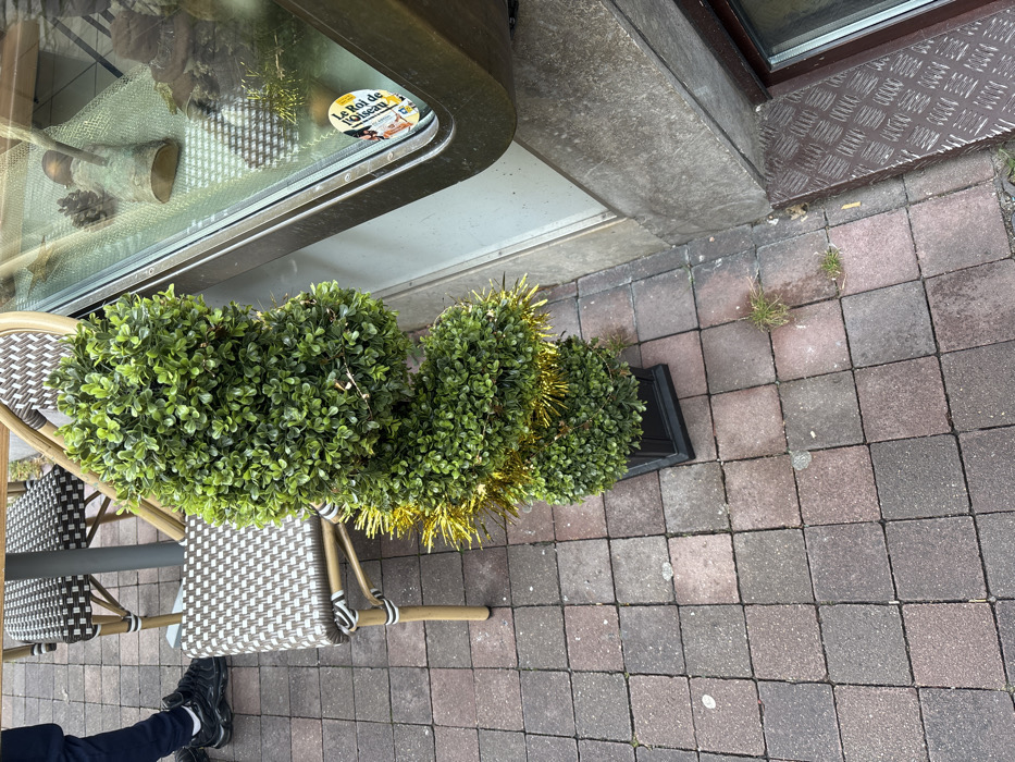 A street-level scene in the city of Unknown, Unknown, depicting an outdoor dining area adjacent to a building facade. The ground is paved with square, interlocking reddish-brown and grey pavers, with scattered small weeds growing in the interstices. On the left, the lower legs and feet of an individual, dressed in dark trousers and black sneakers, are visible near an unoccupied outdoor cafe chair. This chair and an adjacent one feature a woven light brown and white pattern on a light-colored frame, positioned around a small round table with a grey pedestal base. Centrally, a tall, slender artificial topiary plant, formed with three green spherical sections, stands upright in a black rectangular planter. A band of gold tinsel-like material is wrapped around its middle section. To the right, a segment of a building facade includes a large display window with a dark frame. Inside the window, decorative items such as a pine cone and a rustic wooden object are arranged on a light-colored, textured surface. A circular sticker, partially visible, displaying "LE ROI DE L'OISEAU" and additional graphics, is affixed to the lower part of the window glass. The building's lower wall is constructed of grey stone or concrete, transitioning to a dark, textured metal panel at ground level.