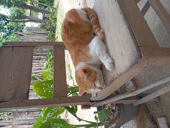 An orange and white cat rests on a wooden chair. The cat is curled up, its tail near its back. The chair is worn and has a simple design. Green plants with white spots grow near the chair. In the background, a fence made of wooden poles is visible, along with trees and a glimpse of a white building. The ground around the chair is dirt.