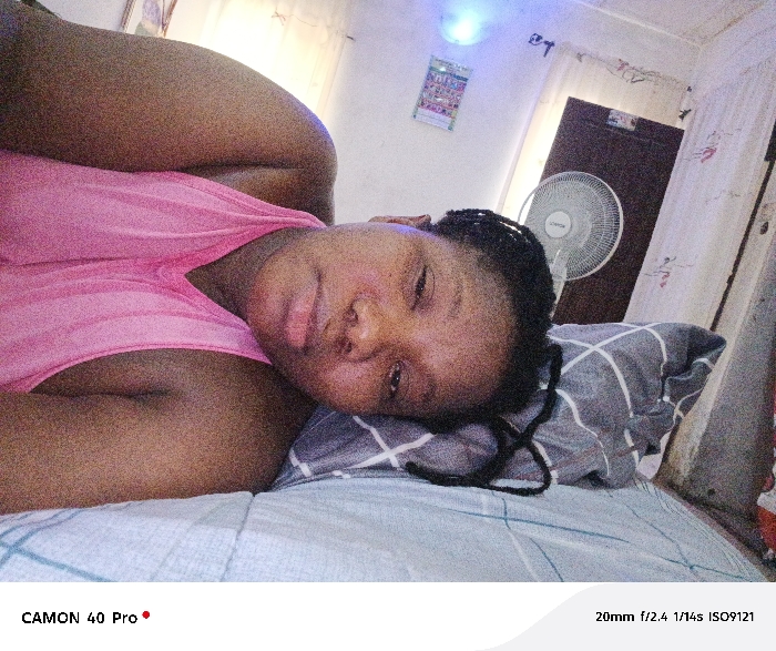 An individual with dark skin and braided hair is depicted lying on their right side on a bed in a residential bedroom in Ado, Nigeria