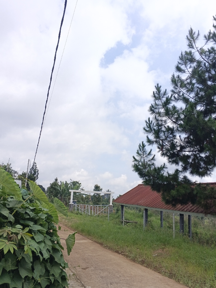 This image depicts an outdoor, rural or semi-rural scene in Man Gyat, Myanmar, under a bright, partially cloudy sky. A narrow, light-colored concrete path, approximately 1.5 meters wide, originates from the lower center of the frame and recedes into the mid-distance, curving slightly to the left. To the immediate left foreground, dense, broad-leaved green foliage, possibly taro or similar plants, occupies the lower quarter of the image, partially obscuring the view beyond. The path is bordered on both sides by unkempt green grass and scattered weeds. On the right side of the path, an open-sided shelter or shed is visible. It features a reddish-brown corrugated metal roof with a moderate pitch, supported by multiple dark grey square pillars. The ground beneath the shelter is grassy. A coniferous tree with dark green needles extends into the frame from the upper right, partially obscuring the shelter's roof. In the mid-distance, to the left of the path, a white, gate-like structure or archway, possibly constructed from concrete or painted metal, stands upright with visible horizontal crossbars. Beyond this structure, a mix of green trees and shrubs, including what appears to be banana trees, is present. An overhead utility wire or cable runs diagonally from the upper left corner of the frame towards the mid-left. The sky occupies the upper half of the image, displaying a light blue hue with numerous scattered white cumulus clouds. No individuals, animals, or active interactions are observed within the scene.