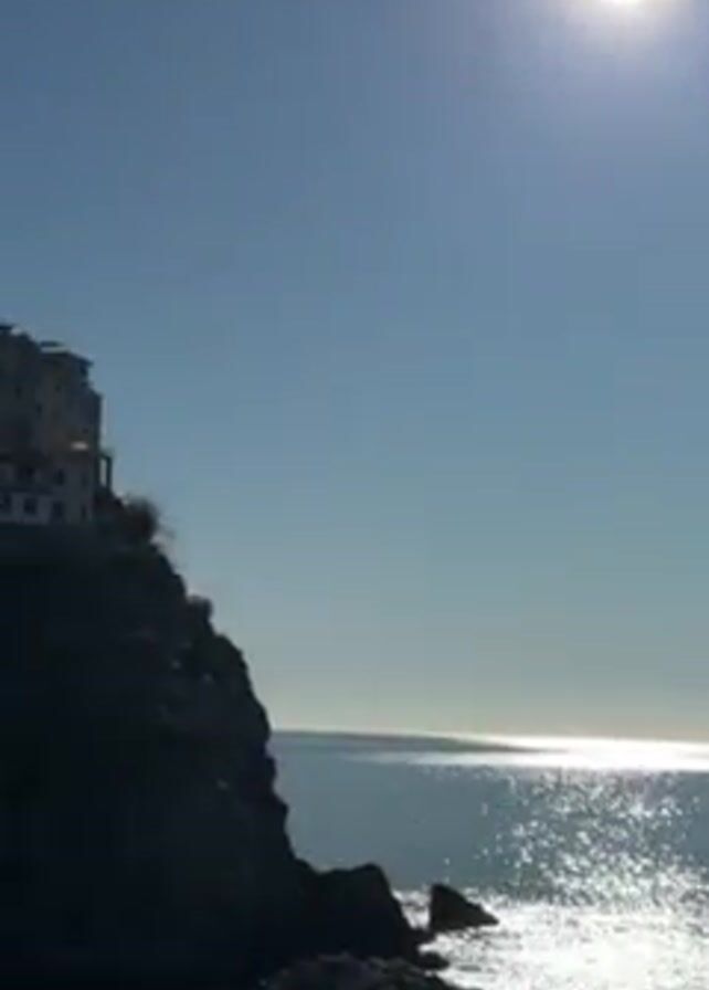 view of the sea, a rocky coastline, and a town built on a cliffside in Cinque Terre, Italy. The sun shines brightly in a clear blue sky, reflecting on the water's surface. The camera pans up from the sea to reveal a cluster of colorful buildings clinging to the side of a steep cliff, part of the picturesque town. The houses are painted in various pastel shades, and vegetation covers the upper part of the cliff.