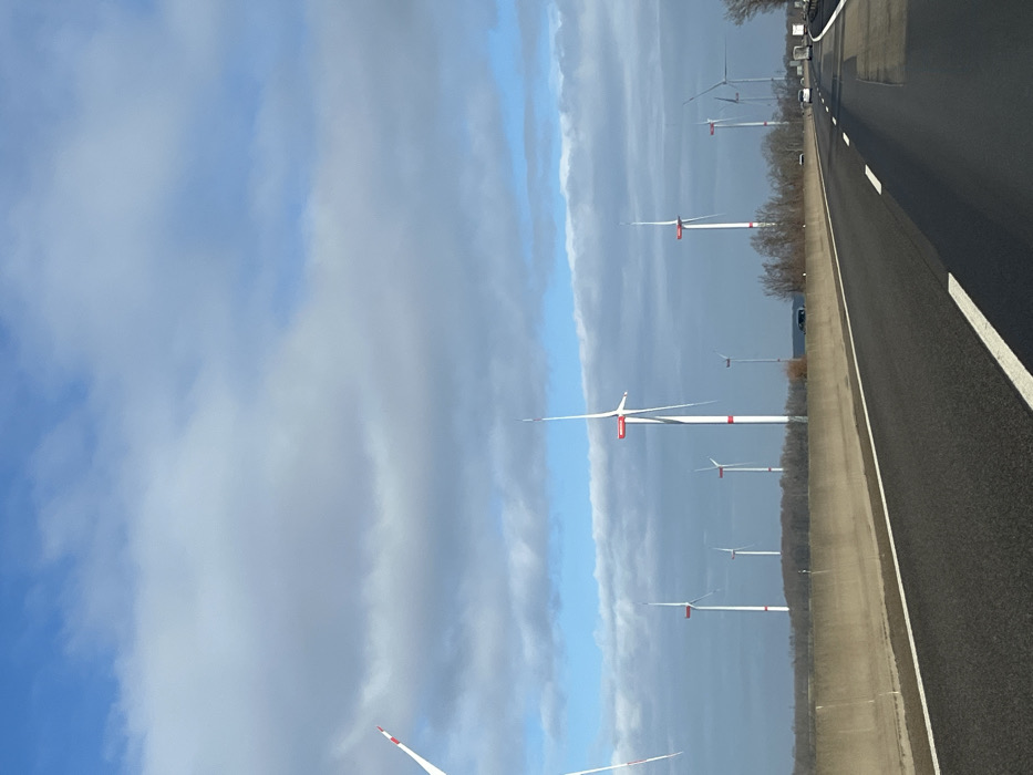 The image presents a daytime scene from a multi-lane highway, likely an autobahn, located in Weilerswist, Germany. The asphalt highway occupies the foreground and midground, extending from the lower center towards the upper right, marked with white solid and dashed lines delineating lanes and the shoulder. A low, light-colored concrete barrier separates the road from the adjacent landscape on the left. Beyond the barrier, a strip of bare deciduous trees forms a low horizon line. In the midground and background, a wind farm is visible, comprising numerous white wind turbines. Each turbine features a tall white tower with a red band near the top and three distinct white blades, the tips of which are also marked in red. At least ten turbines are discernible, with one partially visible on the far left edge of the frame. Several vehicles are visible in the distance on the highway, indicating active traffic. A dark vehicle, possibly a car or SUV, is also visible beyond the concrete barrier in front of the trees. The sky above is partly cloudy, showing patches of clear blue interspersed with gray and white cumulus clouds.