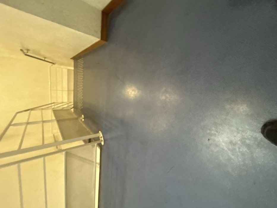 The image displays an indoor stairwell landing within a public access area in Strasbourg, France, viewed from a slightly elevated first-person perspective looking down and forward. The floor in the foreground and mid-ground is a dull blue-grey, appearing to be a resilient material such as linoleum or painted concrete, exhibiting areas of wear and scattered light reflections. The tip of a dark-colored shoe is visible at the bottom center of the frame. Approximately one-third into the image from the bottom, a strip of yellow tactile paving with raised circular dots extends across the floor, signaling an imminent change in elevation. Beyond this, a set of stairs descends into the background. A white metal railing system with multiple horizontal bars acts as a banister along the left side of the descending stairs, its vertical supports anchored to the floor. The walls are a light, off-white or cream color, illuminated by warm artificial lighting. Along the right-hand wall, a dark brown wooden baseboard or trim runs parallel to the floor. A dark metal handrail is mounted on this right wall, accompanying the downward trajectory of the stairs. No other individuals or specific objects beyond the architectural elements are visible.