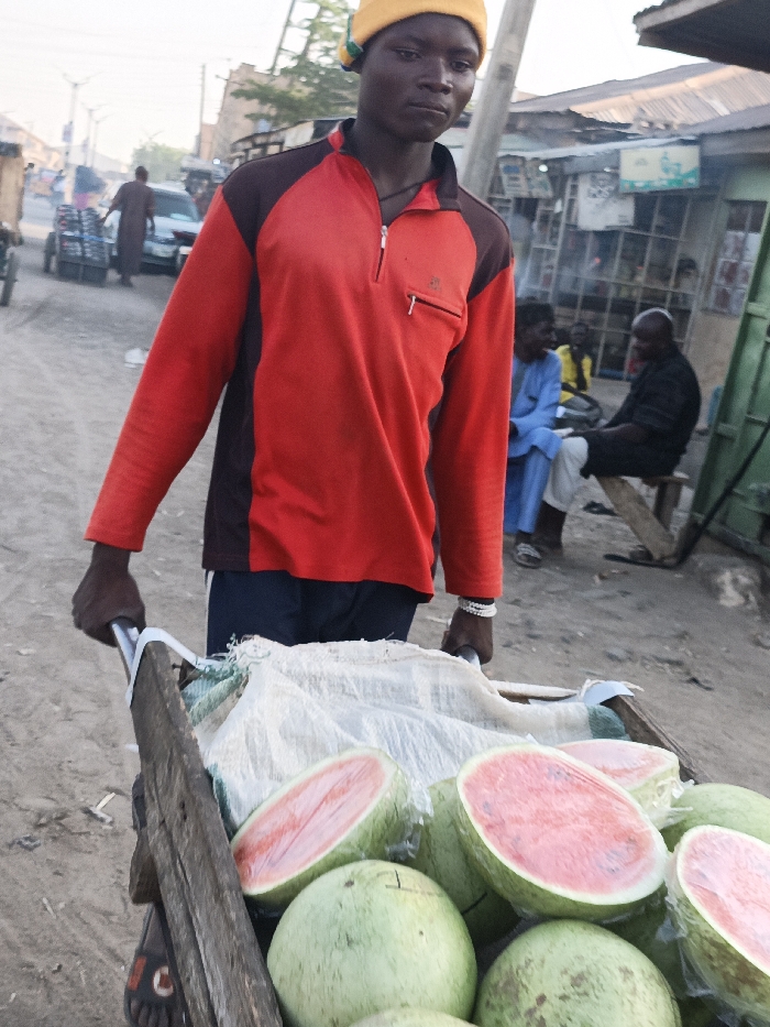 A young man with dark skin, wearing a red and dark brown long-sleeved shirt, dark pants, and a yellow beanie with green accents, is positioned centrally in a street scene in Gawuna, Nigeria. He looks directly at the camera while pushing a wooden two-wheeled cart filled with watermelons. Several watermelons are whole, while others are cut in half, exposing red flesh, and appear to be covered with clear plastic film. His left hand grips the cart's handle; a white beaded bracelet is visible on his left wrist. The immediate ground is dirt. In the mid-ground to the left, another individual in a brown robe is seen pushing a cart, possibly loaded with bottled water, down the dirt road. A light-colored sedan is parked behind this individual. Utility poles and overhead lines are visible. To the right, a group of three males is seated on a wooden bench or similar makeshift seating outside what appears to be a small shop or stall with various goods visible. One man wears a light blue robe, another a yellow shirt, and a third a dark shirt. A green metal gate or door is partially visible on the far right. The background features simple structures, some with corrugated metal roofs, indicative of commercial activity or residences in a bustling urban environment.