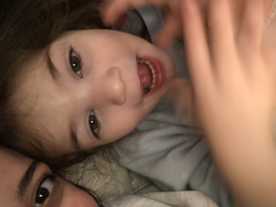 An indoor, close-up image taken in the city of Saverne, France, features two individuals. On the left side of the frame, the right eye, eyebrow, and a portion of the upper face of an adult are visible. This individual has dark brown eyes and dark hair, and wears a light-colored, possibly gray, hooded garment. A young child, with light brown, curly hair and dark brown eyes, occupies the central and right portions of the image, facing forward with an open mouth. The child's upper and lower teeth are visible, with a distinct dark object affixed to an upper molar. The child is wearing a light gray long-sleeved top. A blurred hand, likely belonging to the child, extends horizontally across the lower right quadrant of the frame, indicating motion. The background is out of focus, appearing as a soft, light-colored material.