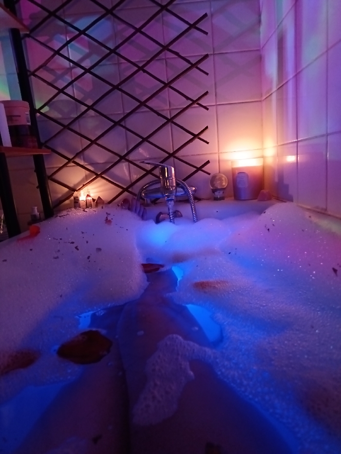 - "A bathtub is filled with bubbly foam, illuminated by blue and purple lighting" by FM-Fezcd2, licensed under CC BY 4.0