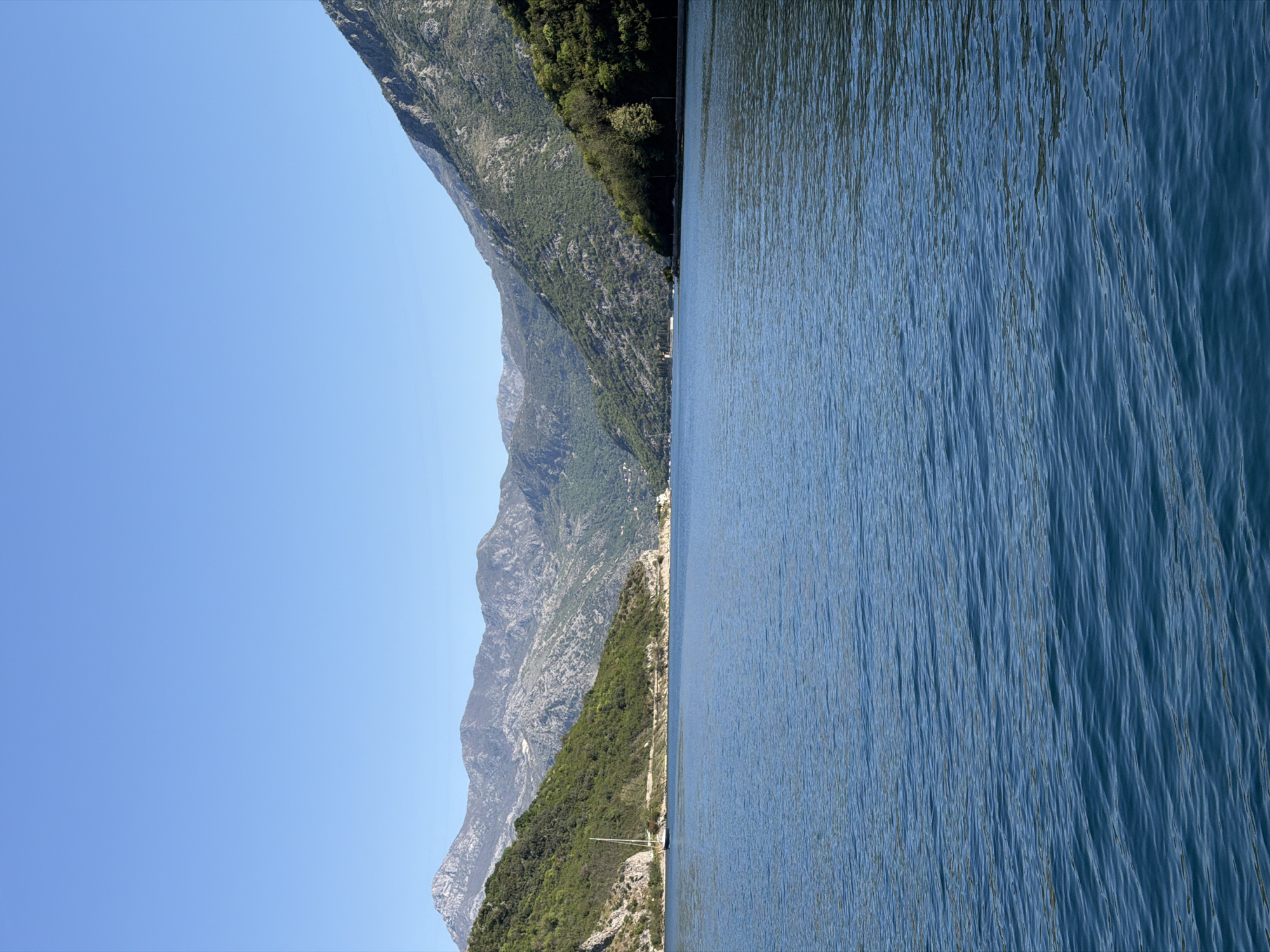 The image depicts a body of water, likely a bay or fjord, with mountains rising on the left side. The water shows light ripples and a deep blue color. The mountains exhibit various shades of green vegetation, with some rocky, gray areas. The sky is clear and blue. A road or path follows the shoreline at the base of the mountains in certain sections. The image is likely taken in Lepetane, Montenegro, given the mountainous coastal landscape typical of the area. No people, animals or interactions are directly visible.