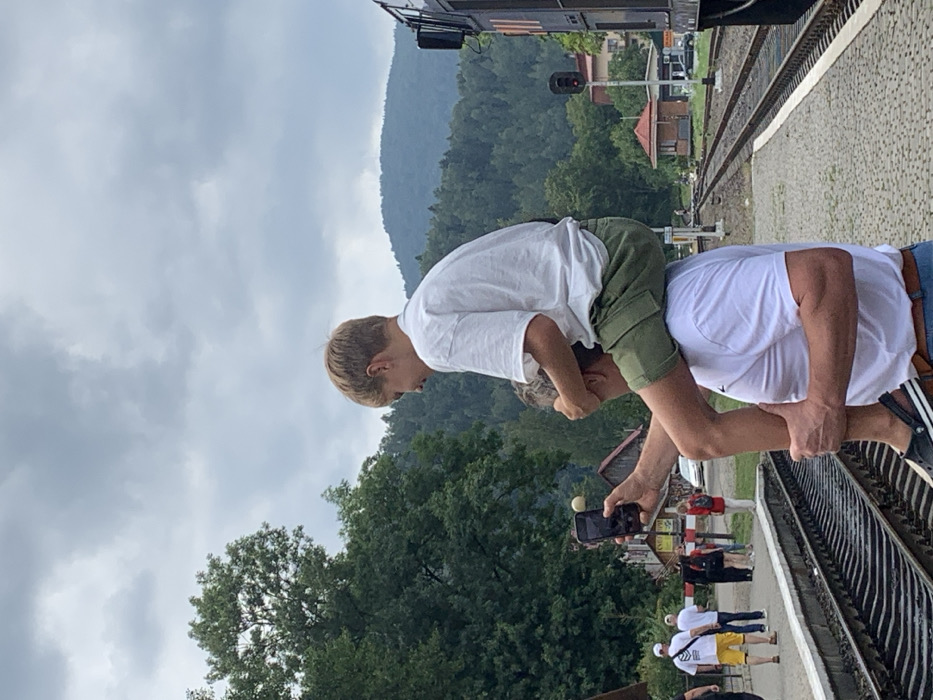 The image depicts an outdoor scene at a train station in Yaremche, Ukraine, under an overcast sky. In the foreground, a man with short, graying hair, wearing a white t-shirt, blue jeans, and black Crocs, carries a blond, pre-teen boy on his shoulders. The man's right arm is extended forward, holding a black smartphone horizontally with a light-colored, spherical attachment on top, while his left hand supports the boy's leg. The boy, dressed in a white t-shirt and olive-green shorts, faces right, looking forward with a slight smile. To the immediate right of the figures, two sets of train tracks run parallel, extending into the distant background. A red-lit railway signal is visible above the tracks in the midground, and a portion of a dark-colored train locomotive occupies the far right edge of the frame. The area beneath the subjects is a paved train platform. In the left midground, several casually dressed individuals are present on the platform near a red and white striped barrier. Behind the tracks, a small building with a red roof and another wooden structure are visible. The background consists of dense green forests covering hills and mountains, characteristic of the Carpathian region.