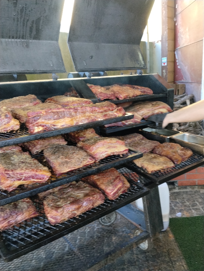 - "A multi-tiered barbecue smoker is filled with rows of thick, seasoned cuts of meat, likely beef ribs or brisket" by FM-xkd7v1, licensed under CC BY 4.0