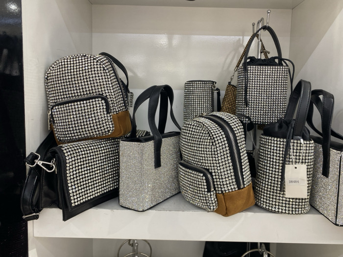 This image displays a retail arrangement of approximately nine handbags and small backpacks on a white shelf
