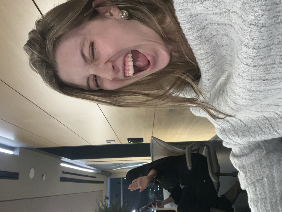 The image depicts two individuals in a modern indoor setting overlooking a city at night. In the foreground, a light-skinned female with light brown hair, wearing a light grey sweater and a silver stud earring on her right ear, is shown with her mouth wide open in an expressive manner, revealing teeth and pink gums, and her right eye tightly squinted. In the background, to the left, a second person with dark hair and dark clothing is seated in a modern-designed chair. This individual holds a dark-colored smartphone in their left hand and has their right hand raised, palm facing the camera, seemingly gesturing. The environment features warm-toned wooden paneling on the right wall and a ceiling with linear light fixtures. Through a large window or opening, a blurred nighttime city skyline with numerous scattered lights is visible. The specific location within Mexico City cannot be determined from the visual evidence, but the scene is consistent with a contemporary indoor space such as a restaurant, lounge, or commercial building situated in an urban high-rise.