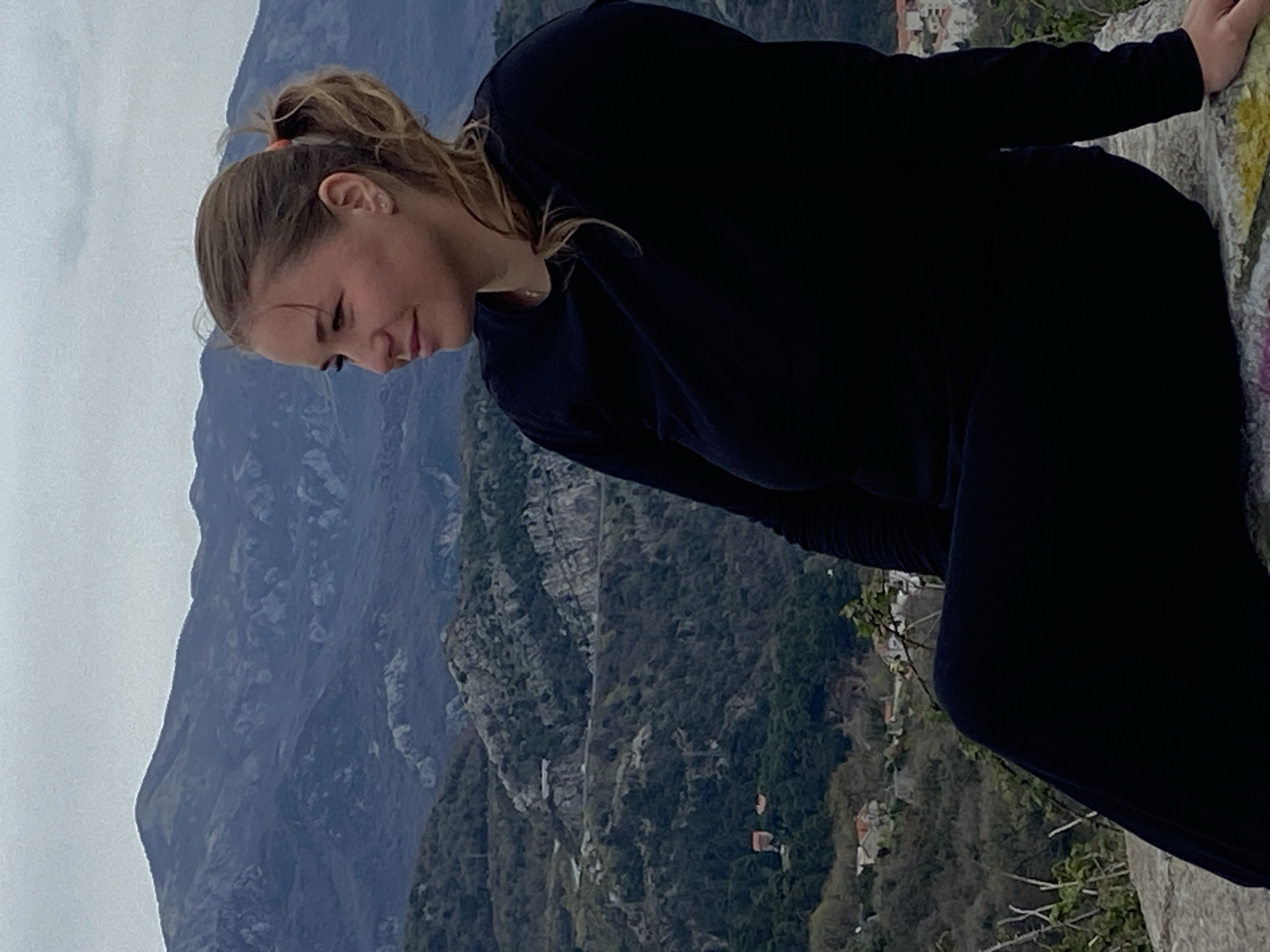 - "The photograph, taken outdoors, depicts a woman in a dark blue sweatsuit standing near a stone wall with a mountain range in the background" by FM-rv1Bv1, licensed under CC BY 4.0