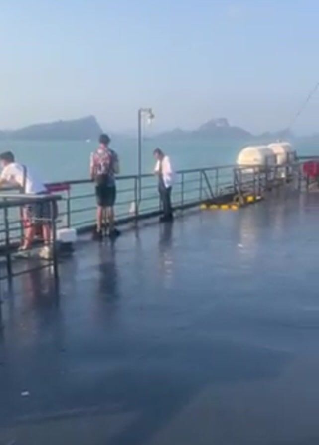 deck of a ferry on a sunny day. The deck is wet and shiny. Several passengers are standing near the railing, looking out at the ocean and islands in the distance. One person is looking at their phone. There are life rafts secured to a metal rack along the railing.
