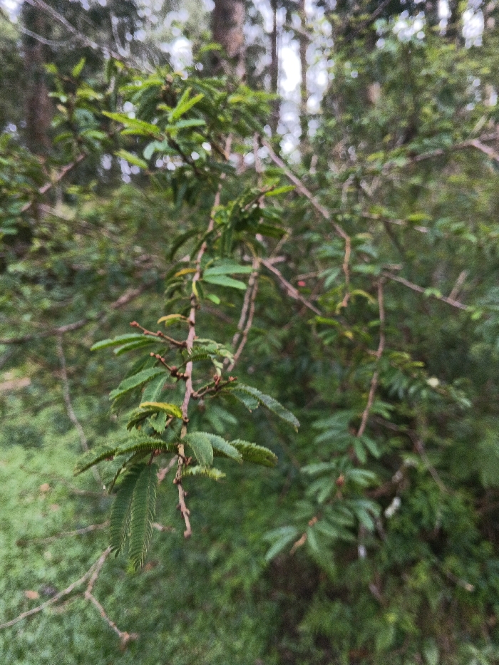 The image presents a close-up, vertical photograph of dense green foliage, consistent with a natural environment in Stueng Saen, Cambodia. The central focus is a slender branch or vine displaying numerous small, pinnately compound leaves, varying in shades of green. Developing buds or young leaflets are visible along the brown-green stems. The background consists of significantly blurred green foliage and indistinct brown tree trunks, indicative of a shallow depth of field which emphasizes the foreground plant material. Natural light illuminates the scene. No human figures, animals, or man-made objects are present or discernible within the frame, and no specific actions or interactions are depicted.