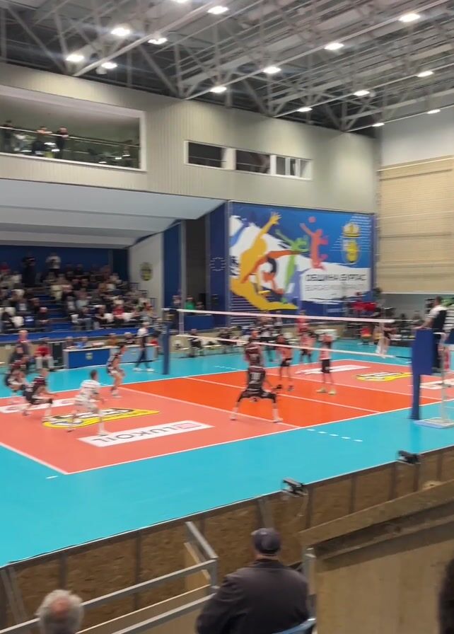 The video captures a volleyball game in an indoor arena