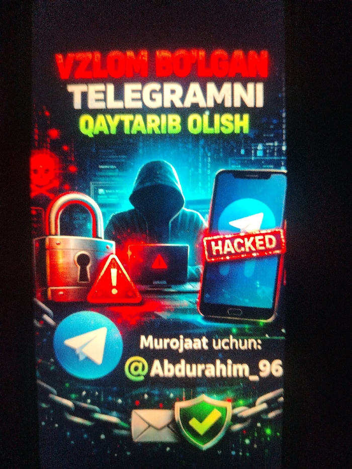 This is a digital advertisement or poster, depicted as situated in Gulbahor, Uzbekistan. The image features a dark, technologically themed background with glowing red and blue highlights, digital data streams, and a red skull and crossbones graphic on the left. The primary text at the top is in Uzbek: "VZLON BO'LGAN TELEGRAMNI QAYTARIB OLISH," displayed in red, white, and green capital letters. This translates to "Recovery of Hacked Telegram." The central imagery includes a hooded figure, silhouetted against a blue glow, positioned behind a laptop displaying a red warning symbol on its screen. To the left of this figure, an open metallic padlock is visible, alongside a red triangular warning sign with a white exclamation mark. To the right of the figure, a dark smartphone is shown upright, its screen displaying the blue Telegram application logo. A red banner with the word "HACKED" in white capital letters is diagonally overlaid across the phone's screen. At the bottom of the advertisement, white text in Uzbek reads "Murojaat uchun: @Abdurahim_96," indicating "For inquiries: @Abdurahim_96." Below this text, a blue circular icon with the white Telegram paper airplane logo is present. The lower portion of the image also displays a metallic chain running horizontally, with a white envelope icon and a green shield icon containing a white checkmark placed upon it.