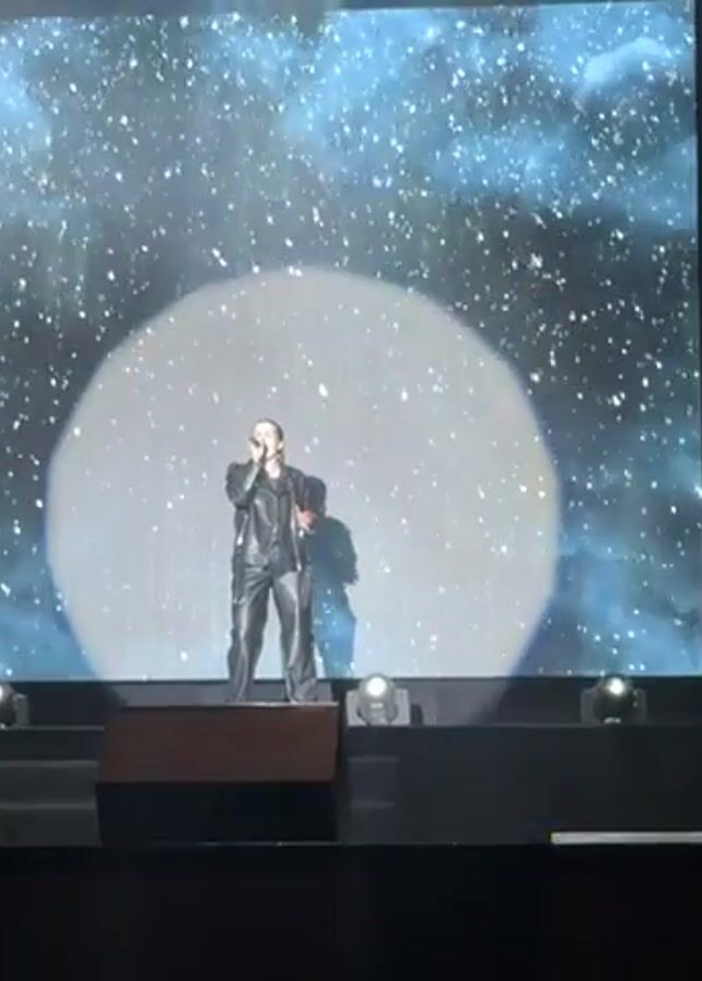 A singer stands center stage at a concert, illuminated by a large spotlight. They are wearing a black leather suit and holding a microphone. Behind the singer is a large screen displaying an image of a nebula with white dots. The stage is dark with rows of lights along the front. The camera is stationary and slightly to the left of the stage, catching the edge of someone's head in the foreground.