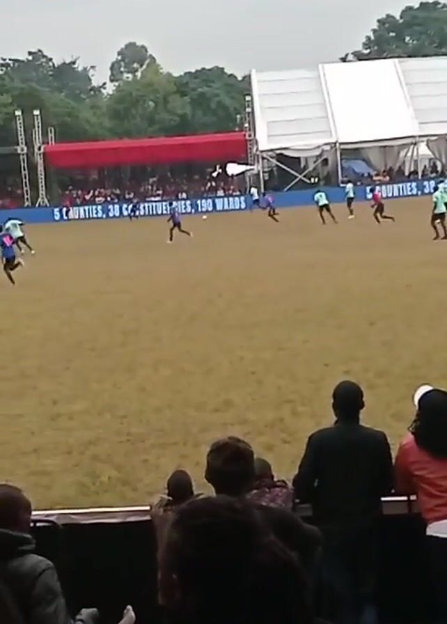 The scene is a wide shot of a soccer game being played on a grass field, viewed from behind a crowd of spectators. Players in blue and pink uniforms run across the field, with the soccer ball in motion. The crowd in the foreground is diverse, with people wearing various clothing including red, black, and white. Beyond the field is a section of stadium seating filled with more spectators. Behind the stands, a white tent structure is visible. The sky overhead is overcast. A banner with the words "5 COUNTIES, 30 CONSTITUENCIES, 190 WARDS" is displayed on the side of the stadium stands facing the camera. Trees are visible in the background, adding depth to the scene. The camera remains relatively stable throughout the video.