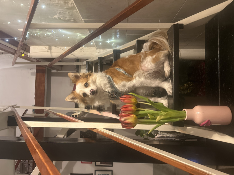 A small dog with tan and white fur stands on a black and white staircase next to a pink vase holding tulips. The dog wears a blue harness and looks at the camera. String lights adorn the ceiling. A brown beam bisects the image diagonally. Framed artwork sits on the floor at the base of the staircase.