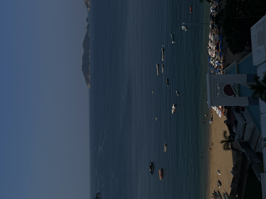 The image displays an elevated panoramic view of Acapulco Bay in Acapulco, Mexico, during daylight hours. The scene encompasses a clear, deep blue sky dominating the upper third of the frame, transitioning to a slightly lighter blue at the horizon. In the mid-ground, the expansive dark blue waters of Acapulco Bay are visible, appearing calm with minimal surface disturbance. Multiple landmasses, likely islands or peninsulas, are silhouetted against the horizon, with one prominent, densely vegetated island located towards the right-center. A small object, possibly a parasail, is suspended in the sky near this island. Numerous small to medium-sized boats, approximately 15-20, are scattered across the bay's surface, predominantly anchored or drifting. These boats vary in color, with several appearing white and others dark-hulled. A line of buoys delineates a swimming area closer to the shore. The lower portion of the image features a wide, light-colored sandy beach. Scattered individuals are visible on the sand and in the shallow water, engaging in activities such as swimming, wading, and sunbathing. Rows of beach furniture, including numerous white, blue, and red umbrellas with accompanying chairs, are set up across the beach area. Several small boats or kayaks are pulled ashore on the left side of the beach. In the immediate foreground, a portion of a building or resort structure is prominent, partially obscuring the lower right section of the beach. This structure features a distinctive white, arched facade with an intricate patterned design. A body of blue water, likely a swimming pool, is visible directly in front of this structure. Other dark-roofed buildings, lush green foliage including palm trees, and several thatched structures (palapas) are discernible along the edges of the beach and behind the main foreground building. The overall lighting suggests either early morning or late afternoon, with some areas appearing shadowed.
