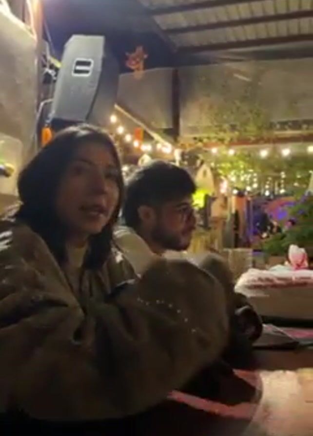 four people seated at a wooden table in an outdoor setting with a corrugated metal roof. There are hanging lights and Halloween decorations visible in the background. The woman closest to the camera is wearing a tan jacket and speaking. A man with glasses and a white shirt is seated next to her, listening. The camera pans to the right, showing two other people seated at the table. One is a woman wearing a black jacket, and the other is a man in a tan sweater. There is a beer bottle and other items on the table.