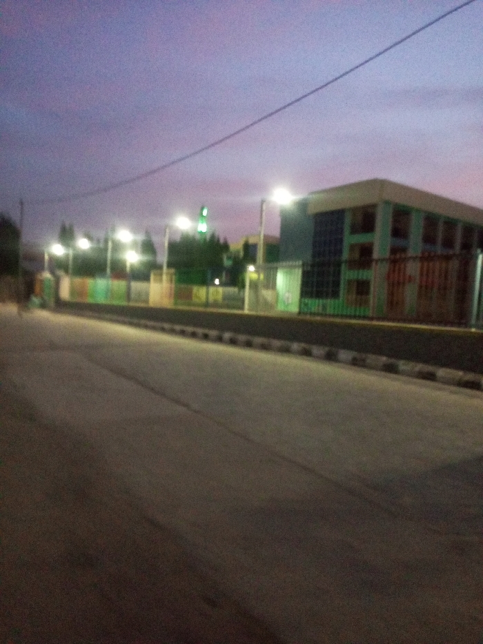 street in Maiduguri, Nigeria (latitude: 11.816, longitude: 13.155). The scene is taken at dusk, with the sky transitioning from purple to dark blue. There are streetlights illuminating the road, which is paved and appears to be empty. On the right side of the image, a building with a green facade is visible. The building is surrounded by a fence and appears to be closed. There are trees on both sides of the street, and the lights are casting shadows from the trees onto the road. There are no people or vehicles visible in the scene. The image suggests a quiet and deserted setting.