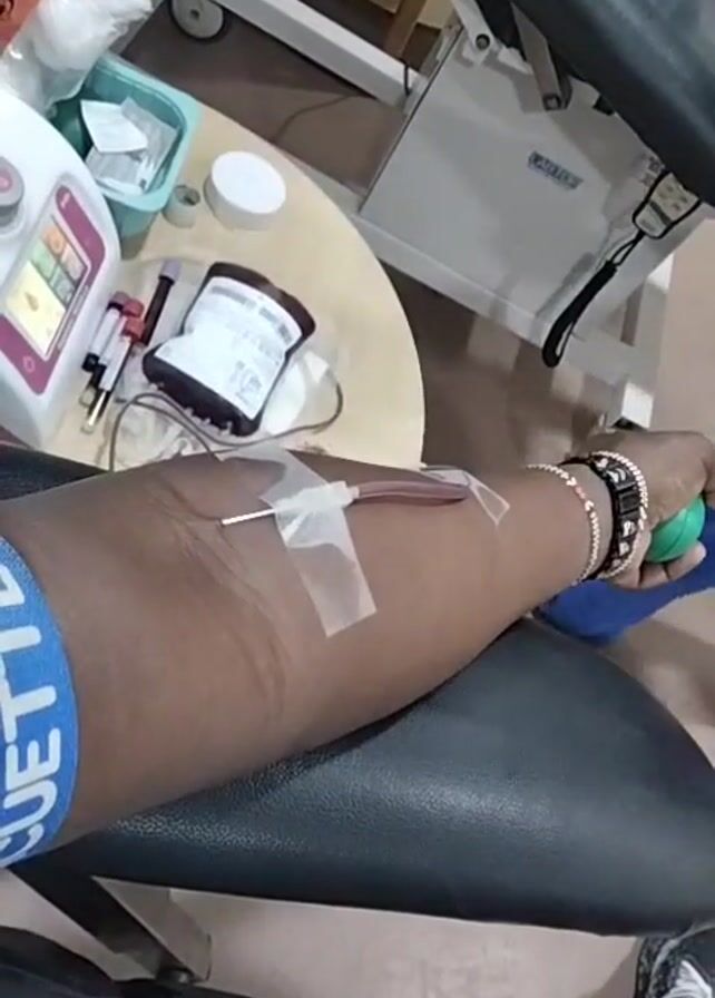 n adult with dark skin donating blood. Their arm is placed on a padded armrest with a needle inserted, secured with tape. A tourniquet is visible on the upper arm. They are clenching a green ball. A bag of blood and test tubes are on a nearby table, along with medical supplies and a machine. The room appears to be a medical facility.
