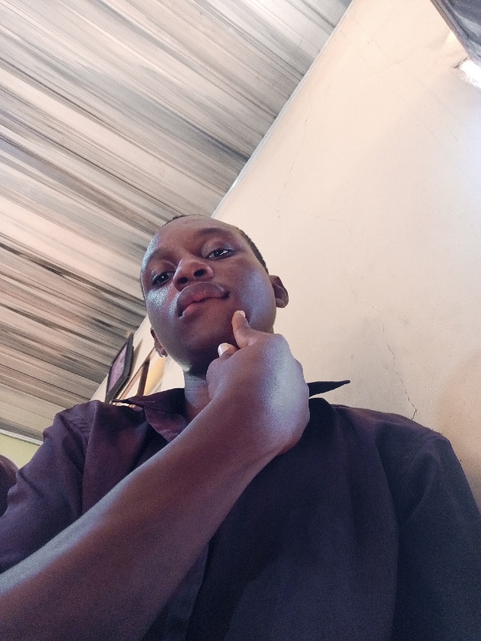 This image captures a young male individual, with dark skin and short hair, indoors in the city of Nsugbe, Nigeria