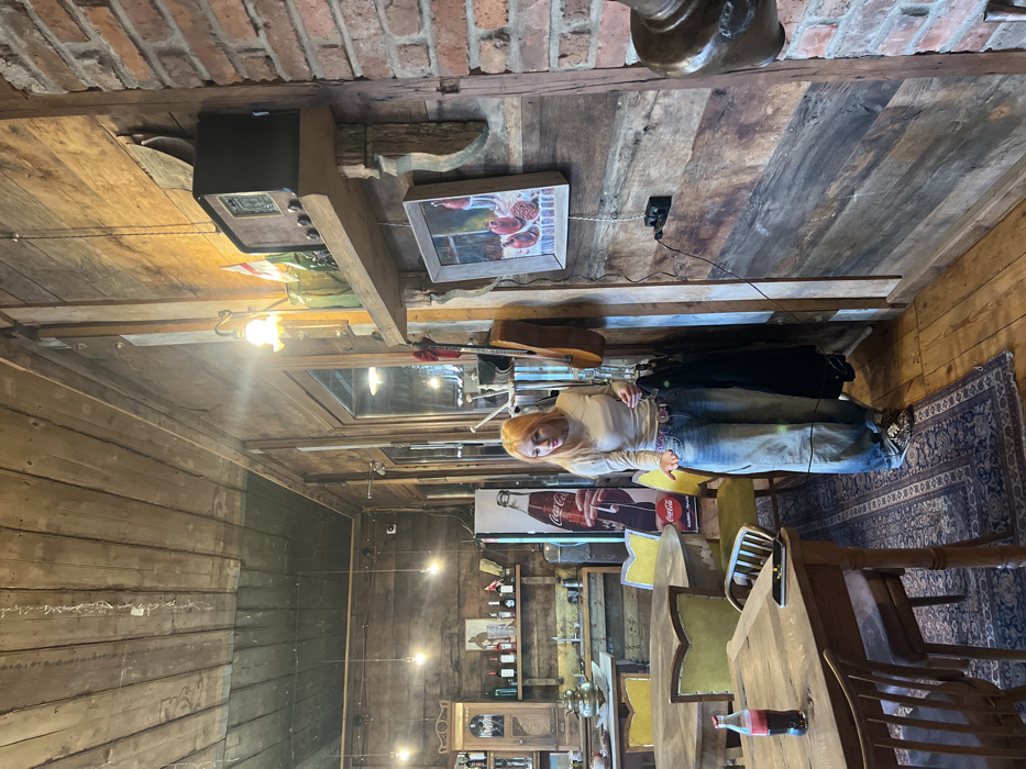 interior of a rustic, wooden building with vintage decor. A woman in jeans and a long-sleeved shirt is visible, surrounded by tables, chairs, and a rug. Various items adorn the walls, including paintings, a Coca-Cola advertisement, and a guitar. A glass cabinet displays bottles, possibly of wine. The ceiling is a mix of brick and wood, with a retro radio mounted on a beam. The overall impression is of a cozy, eclectic space.