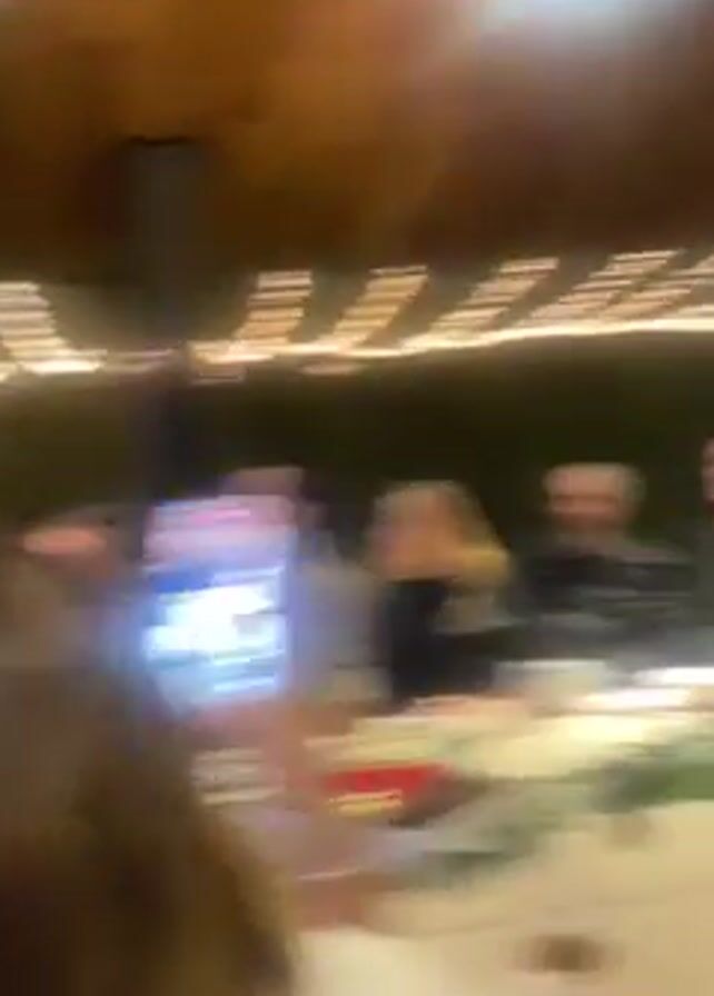 gathering of people seated around a long table, likely at an outdoor dining area. There are several individuals visible, including women and men of varying ages. The table is covered with a tablecloth and has various items on it, such as glasses and decorations. Overhead, there are string lights illuminating the area, giving a festive ambiance. The video quality is somewhat blurry and the camera movement is shaky. At the beginning of the video, a person is standing and talking to the group.