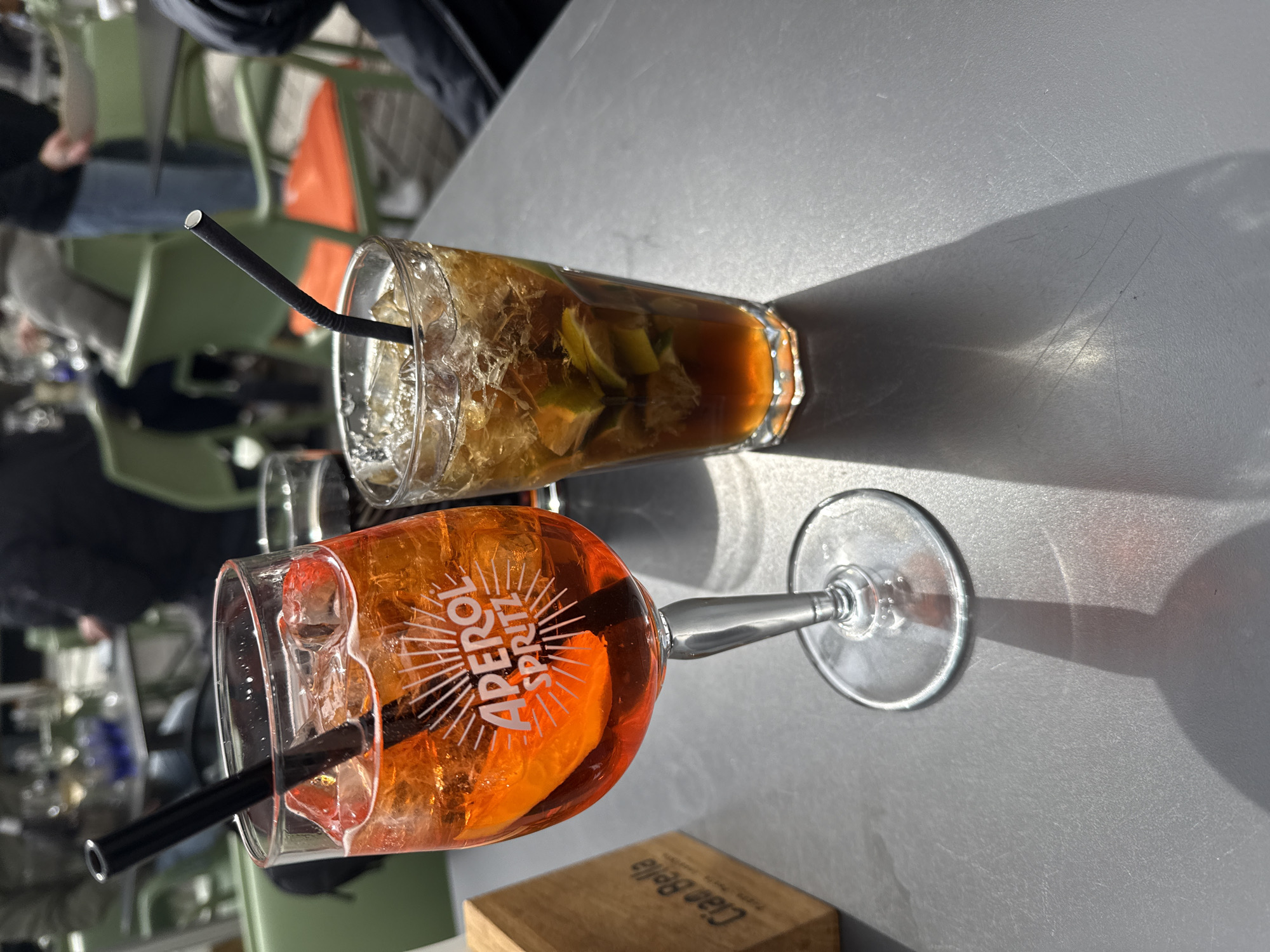 The image displays an outdoor cafe or restaurant setting in Ulm, Germany. In the foreground, a gray table surface is visible under direct sunlight, casting distinct shadows. On the left, a stemmed glass holds an orange-colored liquid, identified by the "APEROL SPRITZ" branding, containing ice cubes and an orange slice. A black straight straw is inserted. To its right, a tall, straight-sided glass contains a brown liquid with ice cubes and multiple lime wedges; a black, bent straw is present. A light-colored wooden block inscribed with "Ciao Bella" is partially visible on the far left of the table. The background is out of focus, showing blurred figures of individuals, tables, and chairs, some with light green frames and orange seats, indicating a public gathering area.