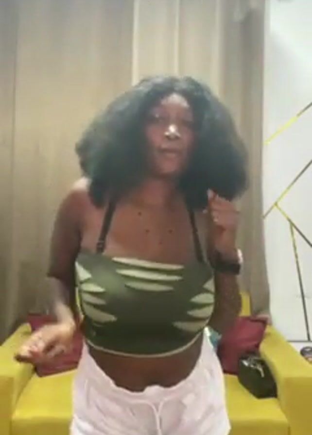 A dark-skinned woman with a large afro is dancing in what appears to be a living room. She is wearing a camo-style strappy crop top and white shorts. Behind her is a yellow couch with throw pillows and a shark stuffed animal. A curtain hangs behind the couch and there is an accent wall with a geometric pattern. The woman is moving her arms and legs rhythmically to music.