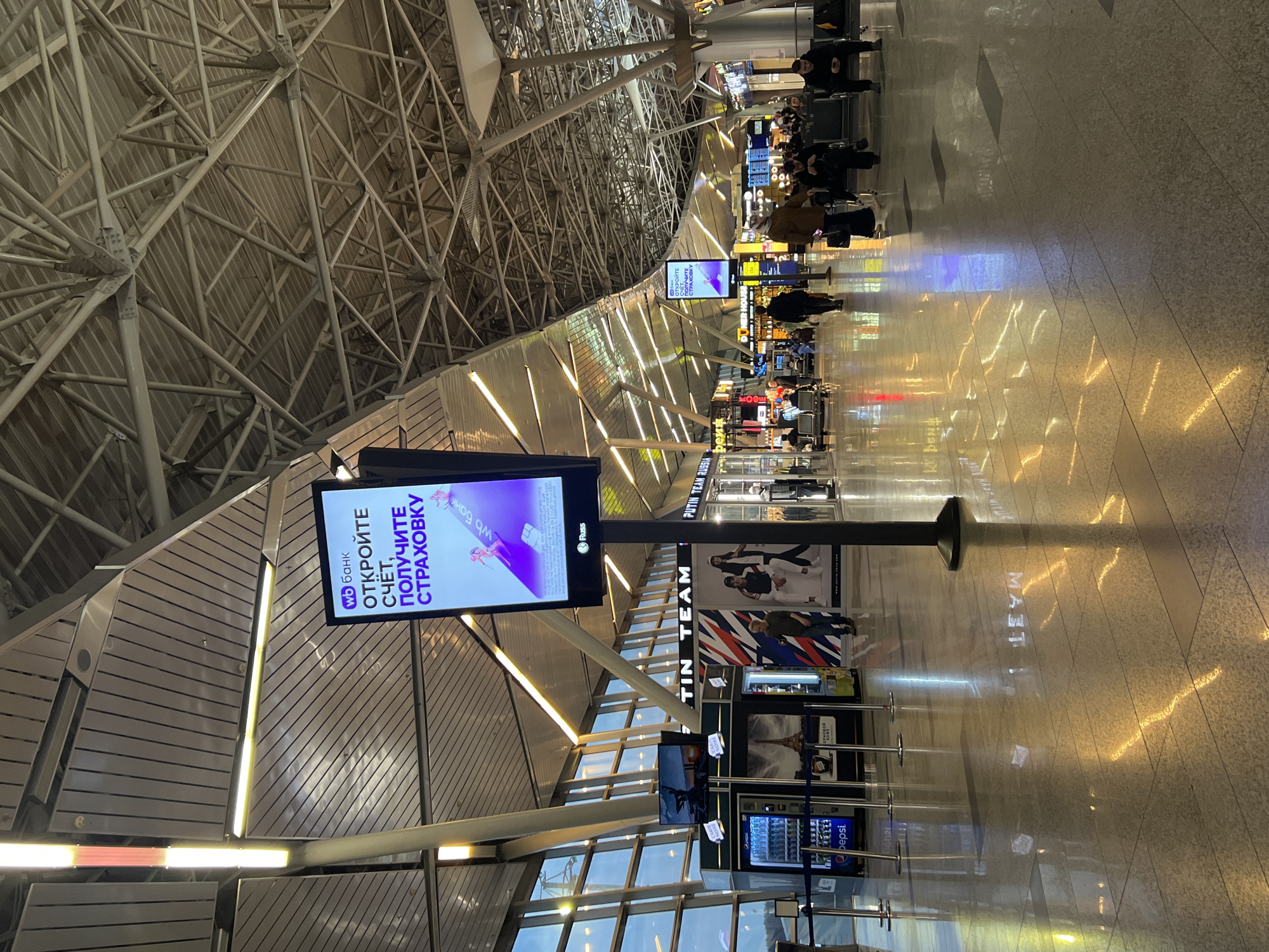 This indoor shot captures an airport scene, potentially in a city identified as Unknown, Unknown. The airport terminal is bustling with people waiting in lines. Structural elements such as metal support beams, angular ceiling fixtures, and expansive glass windows dominate the architectural layout. Digital signage displays Russian text alongside Pepsi vending machines, and shop displays. The reflective tiled floor gleams under the lighting.