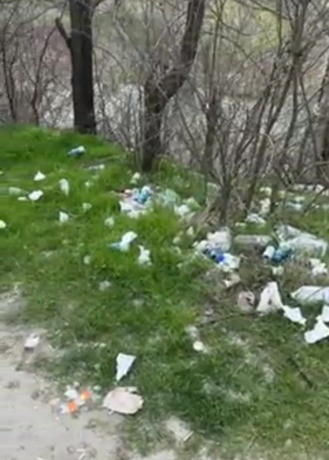 grassy hillside scattered with litter. The trash consists of plastic bottles, wrappers, and other debris. Behind the grass are a few bare trees and shrubs. The video is taken from a low angle, with a dirt path in the foreground. The camera pans slightly to the right. A voice says, "Please don't do this. Don't hurt the nature, please." The voice then says, "We have to appreciate..."