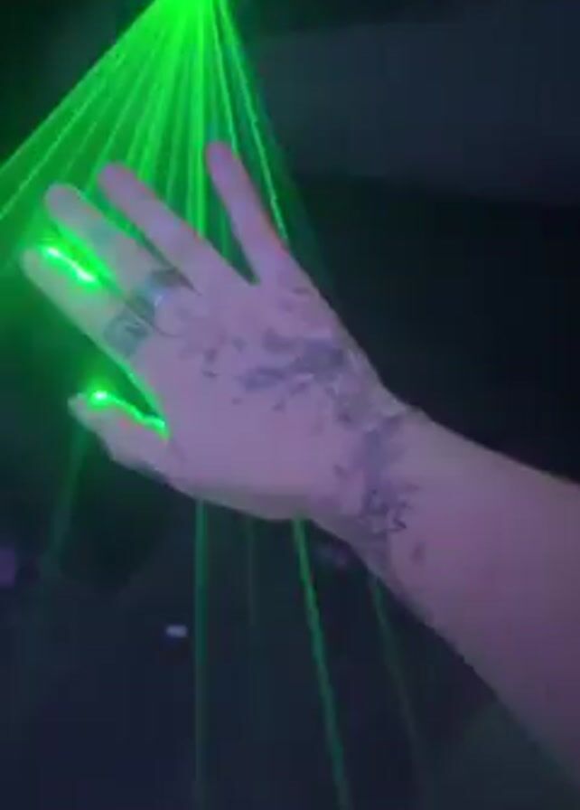 person's hand illuminated by green laser lights in a dark environment. The hand is adorned with tattoos and a ring on the ring finger. The laser lights are projected from above, creating a dynamic pattern on the hand. The person moves their hand slightly, causing the light to shift across the tattoos. The setting appears to be a party or club with music playing in the background.