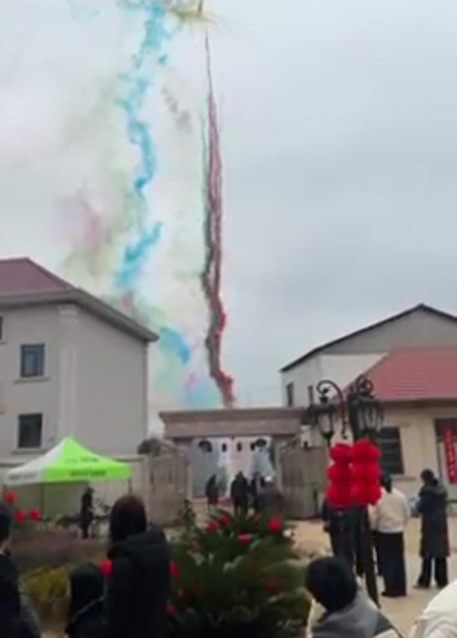 celebration in what appears to be a village or rural area. Several people are gathered, standing and sitting, in front of a decorated entrance gate. Red balloons are tied to a lamppost. In the sky above, there are colorful trails of smoke in shades of red, blue, and green, with what seems to be the remnants of fireworks at the top. A green tent can be seen on the left side of the screen. The overall atmosphere suggests a festive or celebratory event. The sky is overcast. Buildings are visible on either side of the entrance gate. The video is taken from a stationary position.
