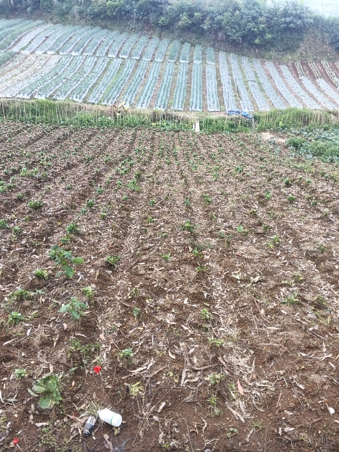 The image displays an agricultural scene on a hillside near Pinnwe, Myanmar. The foreground consists of a cultivated field with dark brown soil, arranged in linear rows containing numerous small green plants, indicative of early-stage crops. Scattered organic debris, including dried leaves and twigs, covers the ground. In the lower-left corner, a white plastic bottle, a dark object resembling a bottle cap, and a single red flower or marker are visible. Midground elements include a dense band of green vegetation, possibly a boundary or a different crop type, separating the foreground field from a series of terraced agricultural plots ascending the hillside. These upper plots are characterized by parallel rows predominantly covered with light-colored plastic sheeting, acting as mulch, with evidence of green vegetation growing beneath. A small blue tarp is discernible within these mulched fields. The background features a heavily forested hillside or mountain under an overcast or hazy sky. No individuals are present within the depicted scene.