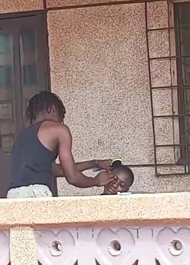 From a medium distance, the video depicts two men on a balcony. One man, wearing a dark tank top and light pants, stands and appears to be grooming or tending to the face of the other man. The second man is seated and leaning forward as the first man works on his face. They are positioned behind a decorative balcony railing with heart-shaped cutouts. Behind them, a building exterior is visible, including a dark door and a window with bars. The environment seems to be outdoors during daylight.