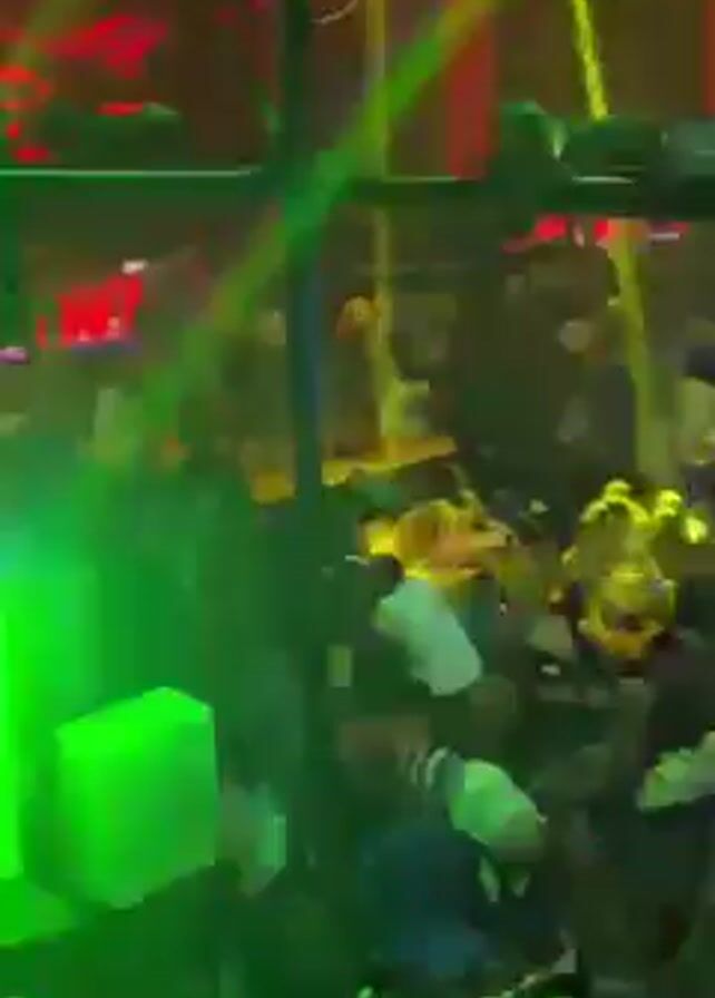 The video depicts a crowded nightclub or bar scene. The lighting is dark and moody, with colored lights flashing in red, green, yellow, and blue. Many people are standing and moving around; their specific actions aren't discernible due to the poor visibility. The camera angle is looking out from a higher level at the scene. The environment appears lively and energetic, consistent with nightlife activity. Tables, other furniture, and unidentified objects populate the space.