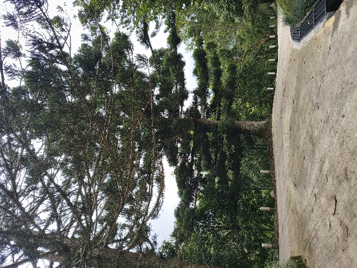 A tall pine tree dominates the scene, its branches spreading wide. Dense foliage surrounds it, creating a lush green backdrop. A concrete path with small vertical posts runs along the side, suggesting a walkway through the greenery. The image is taken from a slightly low angle, emphasizing the height of the tree.
