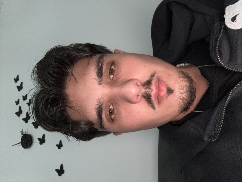 A male individual is depicted centrally, facing the camera with a neutral expression. He has dark, wavy hair, brown eyes, a mustache, and a soul patch beard. He wears a black zippered hoodie over a visible black garment. A light-colored, possibly beaded, necklace is visible on his right side, and a thin gold-colored chain hangs lower. The background is a plain, light-colored wall. On the wall, above and behind his head, is a black wall clock, potentially indicating 10:20, with a small green plant object attached to its mechanism. Numerous black butterfly-shaped wall decals are arranged irregularly around and below the clock. The scene is located in Grad Rijeka, Croatia.