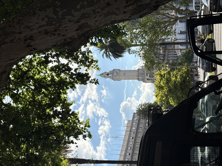 A clock tower rises amidst trees and buildings under a cloudy sky. The tower is light-colored with a green dome. Buildings with horizontal lines are visible on the right side of the tower. Palm trees stand alongside the tower. Dark objects, potentially vehicles, are partially visible on the right, framing the scene. A large tree trunk and foliage on the left also frame the view.