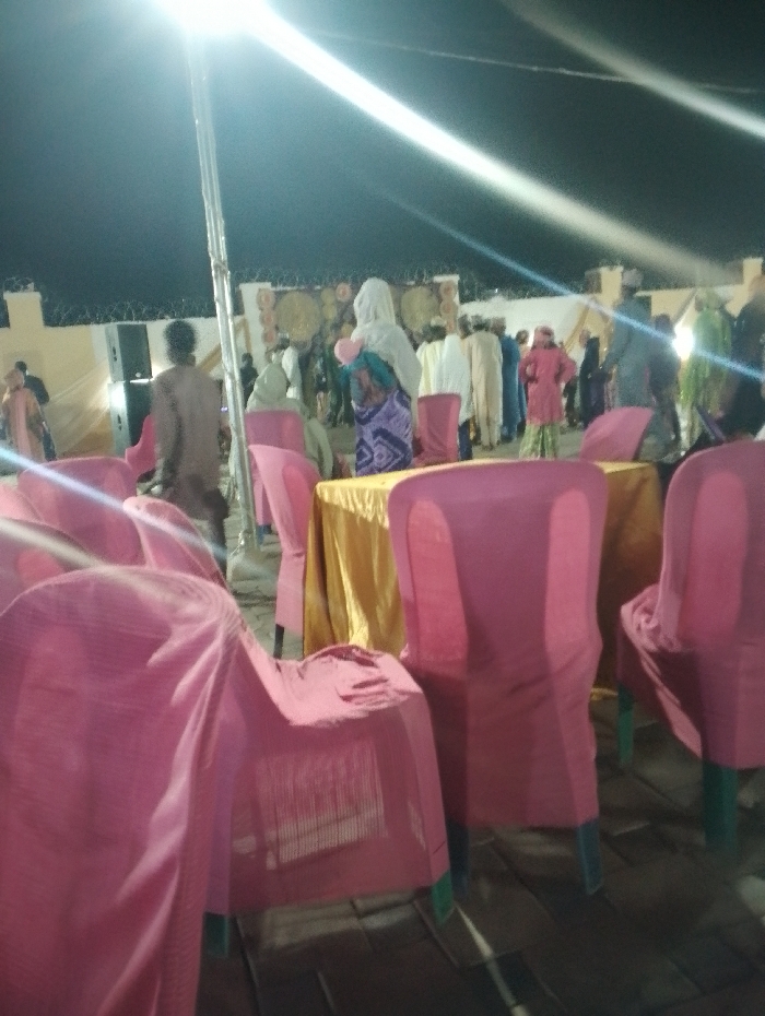 An outdoor event under a bright light reveals many people, some standing, others seated. A woman in a hijab holds a pink object. The tables are draped with gold fabric and pink chair covers. A speaker stands near a white wall. Some guests are dressed in traditional clothing. The atmosphere is festive.