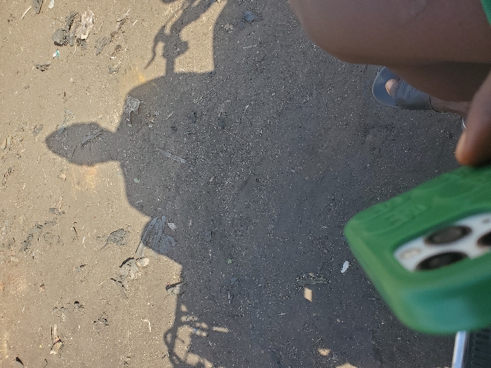 The image depicts an outdoor ground-level scene in Birnin Kebbi, Nigeria, under direct sunlight. The terrain is unpaved, consisting of dry, sandy earth with scattered debris, small rocks, and organic detritus. In the lower left foreground, a dark-skinned hand holds a smartphone encased in a bright green protective cover, partially revealing its multiple rear camera lenses. To the right, a dark-skinned thigh and knee are visible, along with a foot wearing a dark-colored, open-toed sandal. A large, human-shaped shadow, displaying a head, shoulders, and torso, is prominently cast across the central ground. Adjacent shadows on the left and right indicate the presence of a vehicle, with recognizable elements resembling handlebars, suggesting the individual is situated on or next to a motorcycle or similar two-wheeled transport.