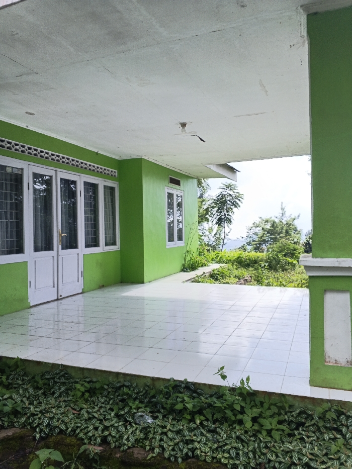 The scene depicts the exterior of a building in Nanlao, China, featuring a prominent, bright green painted wall with white trim. A covered porch or veranda extends from the building, paved with light-colored square tiles. The porch ceiling is white and shows signs of discoloration and minor cracks, with a damaged ceiling fixture visible. On the left side of the building, there are multiple white-framed windows and a set of double white-framed glass doors, above which runs a horizontal strip of white decorative vents. Further right along the green wall, another white-framed window is present. Immediately in front of the tiled porch, a strip of ground is covered with dense green foliage, including small-leafed plants, some exhibiting patterned leaves. A discarded clear plastic bottle is visible among this vegetation. Beyond the porch and the immediate ground cover, the terrain slopes downwards, densely vegetated with various trees and shrubs. In the background, under an overcast or bright sky, a distant landscape of hills or mountains is visible, indicating a rural or semi-rural elevated location. No individuals or active subjects are present in the image.
