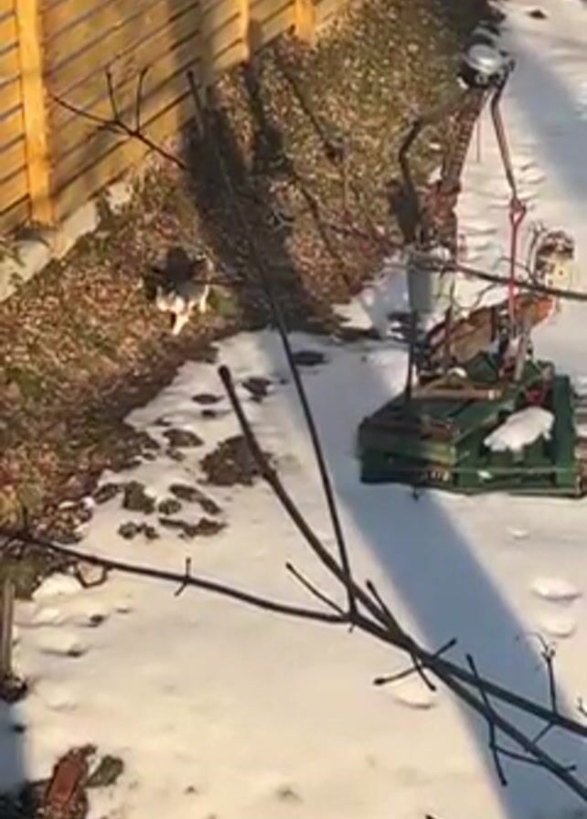 The video depicts a yard partially covered in snow, with a wooden fence running along the left edge of the frame. A gray and white cat is walking along the edge of the fence, in an area where the snow has melted to reveal dead leaves and dirt. To the right of the cat, in the snow-covered area, stands a green pallet supporting some kind of mechanical device with a silver container attached. The foreground features bare tree branches that slightly obscure the view. The scene is bathed in sunlight, creating shadows from the fence and the branches.