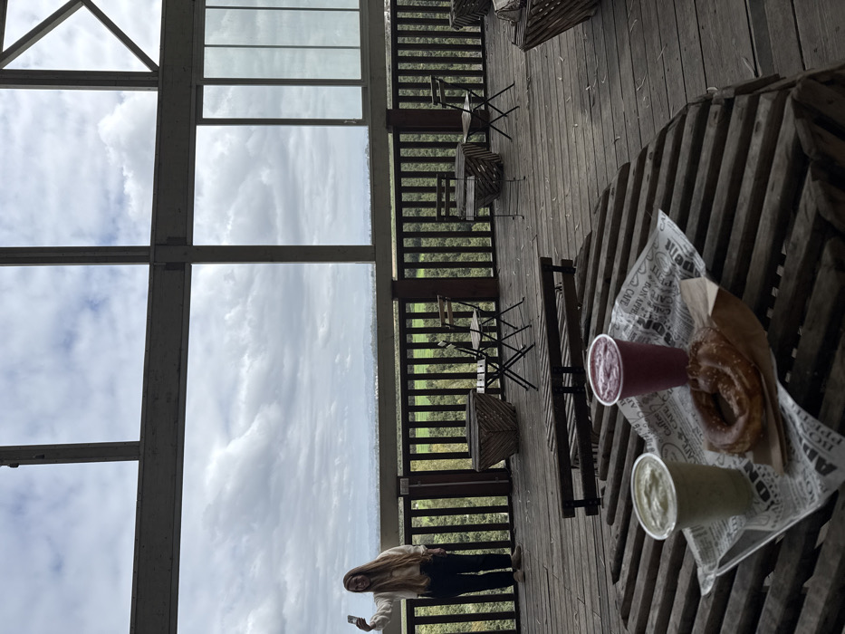 The image captures an elevated outdoor cafe or observation deck located in Kfar Vitkin, Israel. In the foreground, a round wooden slatted table displays two beverages in clear plastic cups—one green and one reddish-purple—alongside a golden-brown pretzel, all resting on a paper-lined tray. A female individual with long, light-colored hair, wearing a light-colored long-sleeved top and dark trousers, stands on the wooden deck near a dark wooden railing on the left side of the frame. She extends her left arm, holding a smartphone as if taking a photograph. The deck area features multiple small metal tables with foldable chairs and wooden benches. Beyond the railing, a panoramic view unfolds, revealing dense green foliage, distant hills, and an overcast sky dominated by substantial cloud cover. Large structural beams frame the upper portion of the scene, with a section of vertical window panes visible on the far right.