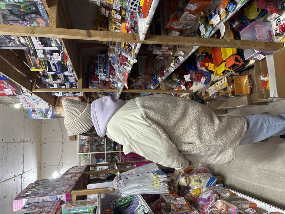 An individual wearing a beige beanie, lilac hoodie, and cream-colored coat stands in a cluttered toy store. Shelves overflow with toys like cars, trucks, dolls, and doctor sets. Packaging labels and price tags are prominently displayed. The setting seems to be a small, local shop with a dense assortment of merchandise. The image's orientation is rotated.