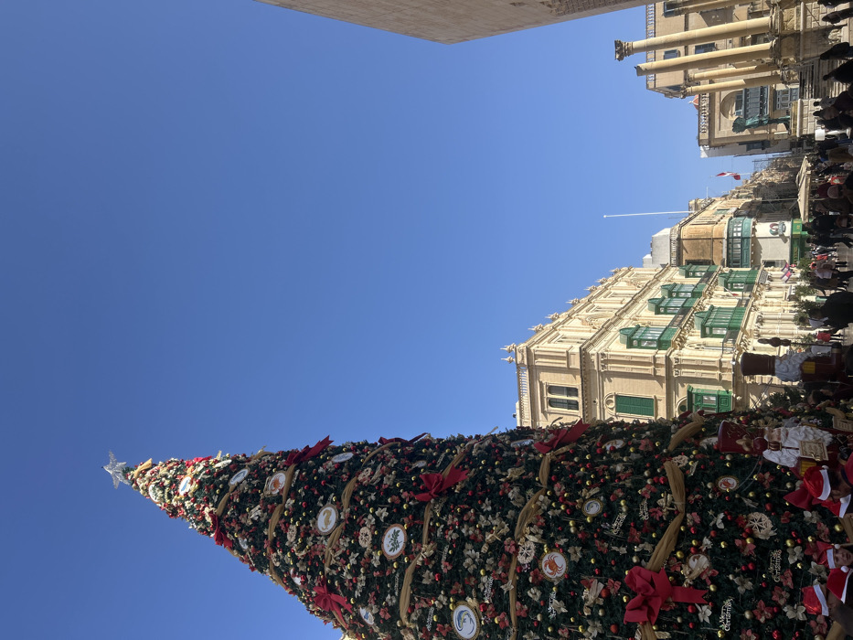 The image displays a large, decorated Christmas tree dominating the left foreground of St. George's Square (Pjazza San Ġorġ) in Valletta, Malta, viewed under a clear, cloudless blue sky. The Christmas tree is tall and conical, adorned with red bows, gold ribbons, red and gold baubles, and circular ornaments featuring various marine life motifs such as crabs and fish. A star tops the tree, and "Merry Christmas" text is visible on some decorations. At the tree's base, large white figures resembling nutcrackers or Santa Clauses are visible, alongside multiple individuals wearing red Santa hats. To the right of the tree, multi-story buildings constructed of light-colored limestone line what appears to be Republic Street (Triq ir-Repubblika), leading away from the square. These buildings exhibit traditional Maltese architectural features, including ornate facades, balustrades, and several enclosed wooden balconies (gallariji), predominantly painted green. Further down the street, classical columns, part of a historical structure (likely the former Royal Opera House ruins or Auberge de Provence), are visible, along with a statue and a distant Maltese flag. A tall white flagpole stands prominent in the midground. The far right features a segment of a large, pale, blocky structure, possibly the Parliament House. Numerous people are observed populating the pedestrianized street and the base of the Christmas tree, indicating a bustling public area. Individuals are walking and congregating, suggesting a lively urban environment during a festive period.