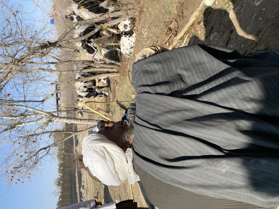 - "An elderly man in a white turban and gray striped suit stands beside a yellow hose irrigating cows tied to trees in a rural setting" by FM-B5wmg2, licensed under CC BY 4.0